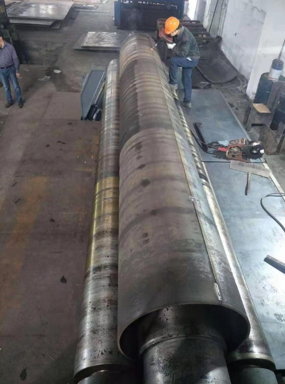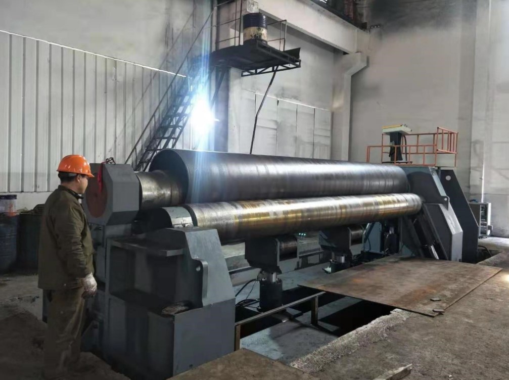 4-валковый листопрокатный станок W12-25х4000 также выполняет изготовление конических деталей за счет регулируемого наклона боковых валков и возможности изменения угла положения нижнего валка для управления большим концом конуса. Станок поддерживает обработку материала шириной до 4 м, что позволяет производить широкий спектр металлоконструкций.