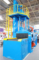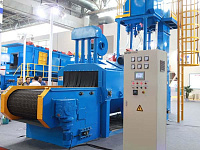 Дробеструйная машина с сетчатым конвейером оснащается высокоэффективными турбинами, оптимально расположенными в полости рабочей камеры, как по вертикали, так и по горизонтали; это гарантирует, что такие участки поверхности, как карманы или углубления, полностью достигаются действием струи. Обрабатываемые объекты перемещаются через полость рабочей камеры с помощью ленточного конвейера, двигающегося по замкнутому циклу. Его несущая лента изготовлена из высокопрочной сетки, изготовленной из марганцовой стали (доступны разные размеры ячеек). Сетчатый конвейер позволяет вводить в операционную зону не только длинные объекты, но и партии небольших деталей, которые не могут быть размещены на рольганговом транспортере. Размещение нескольких небольших деталей рядом друг с другом на сетчатой ленте может значительно повысить производительность. Восемь турбин установлено в камере над лентой и под ней с небольшим горизонтальным и вертикальным углом, что обеспечивает полный однородный обстрел. Специальные направляющие пластины, изготовленные из твердого металла, способствуют высокой интенсивности струи и уменьшают износ машины. Абразивный материал удаляется из камеры, фильтруется и отправляется для повторного использования. Пыль, образовавшаяся в процессе, также удаляется – в пылесборник.