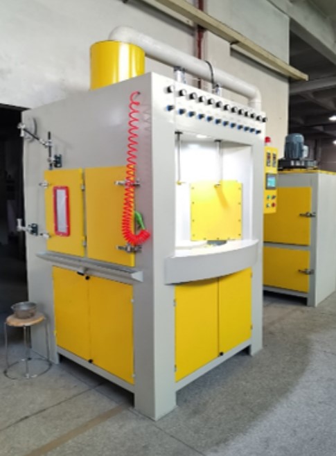 Пескоструйная камера XHB-1820-16A-16G представляет собой современное автоматизированное оборудование закрытого типа, предназначенное для высокоэффективной абразивной обработки металлических изделий. Установка оснащена герметичной рабочей зоной с усиленными смотровыми окнами, автоматизированным поворотным столом с регулируемыми держателями и системой программируемых распылительных пистолетов. Особенностью оборудования является полностью автоматический цикл обработки – оператору необходимо лишь закрепить детали на поворотном механизме, задать параметры через панель управления и запустить процесс. Мощная система пылеулавливания с циклонным фильтром и НЕРА-фильтрацией обеспечивает чистоту воздуха, соответствующую самым строгим экологическим стандартам.